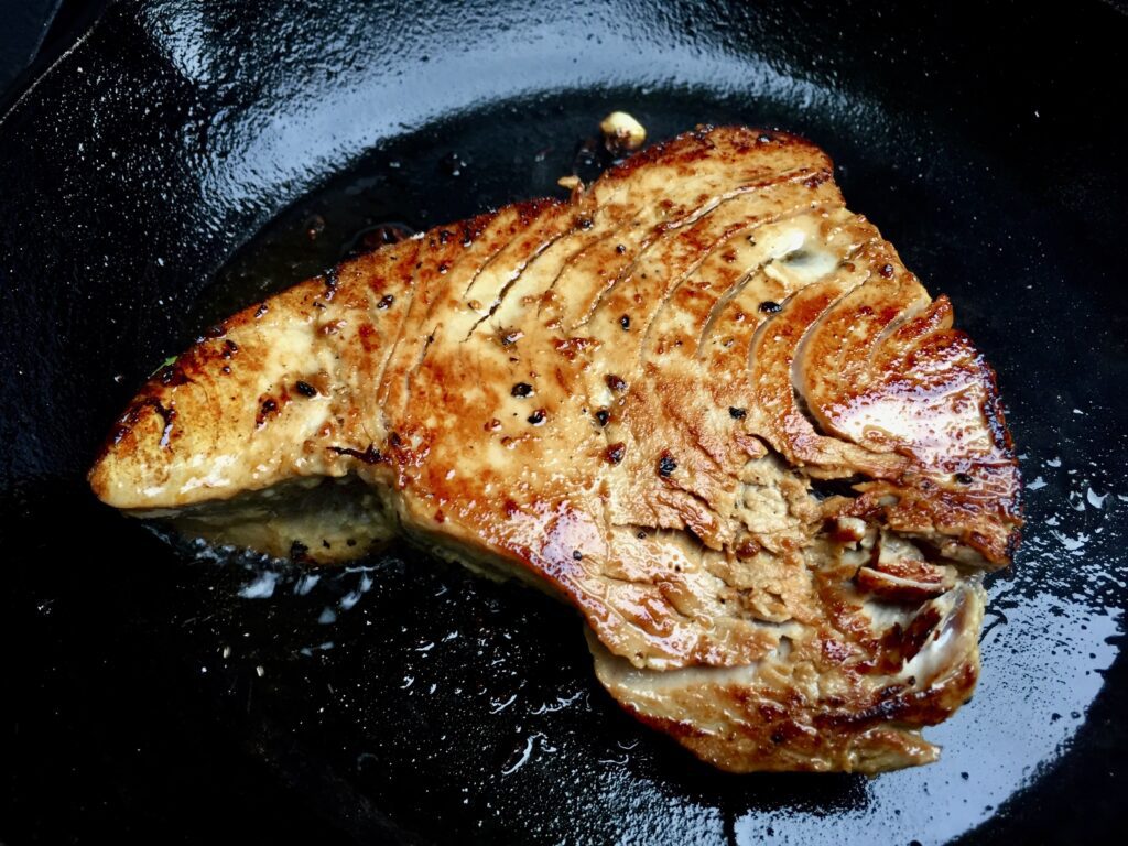 After all the fish has been seared, pour the remaining marinade into the hot cast iron skillet and it should sizzle and cook down very quickly into a nice thick sauce. Pour over fish and then sprinkle with scallions and sesame seeds.