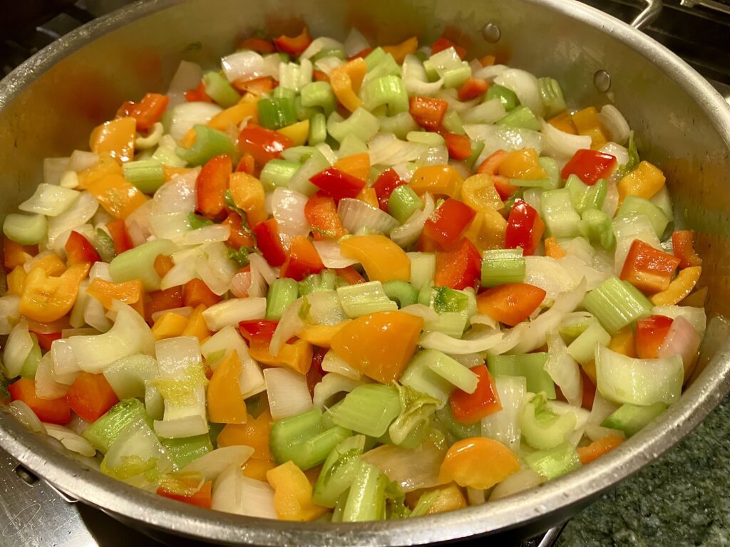 Add the onions, celery and bell peppers and saute´ on high temperature, stirring often, until the onions are opaque, about 7 minutes.