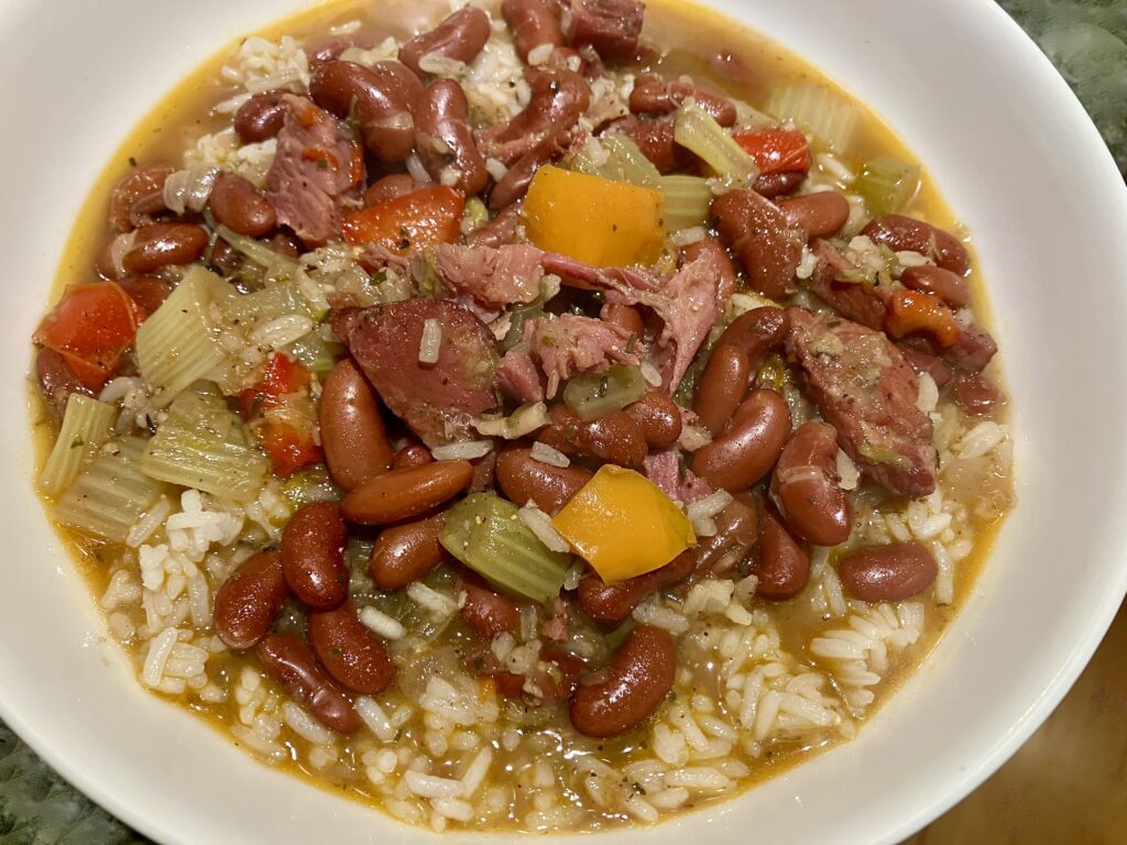 When we think of this meal, Red Beans and Rice, we imagine the steamy languid Sundays of the Creole world of New Orleans in the 1800’s, ham on the table and French wine to accompany that. And then on Monday, which was called Laundry Day throughout the South, they used the scraps and bones from Sunday’s ham feast, tossed in some Red Beans and seasoning, and as it bubbled for hours, the tedious laundry work was accomplished along with a savory lunch.