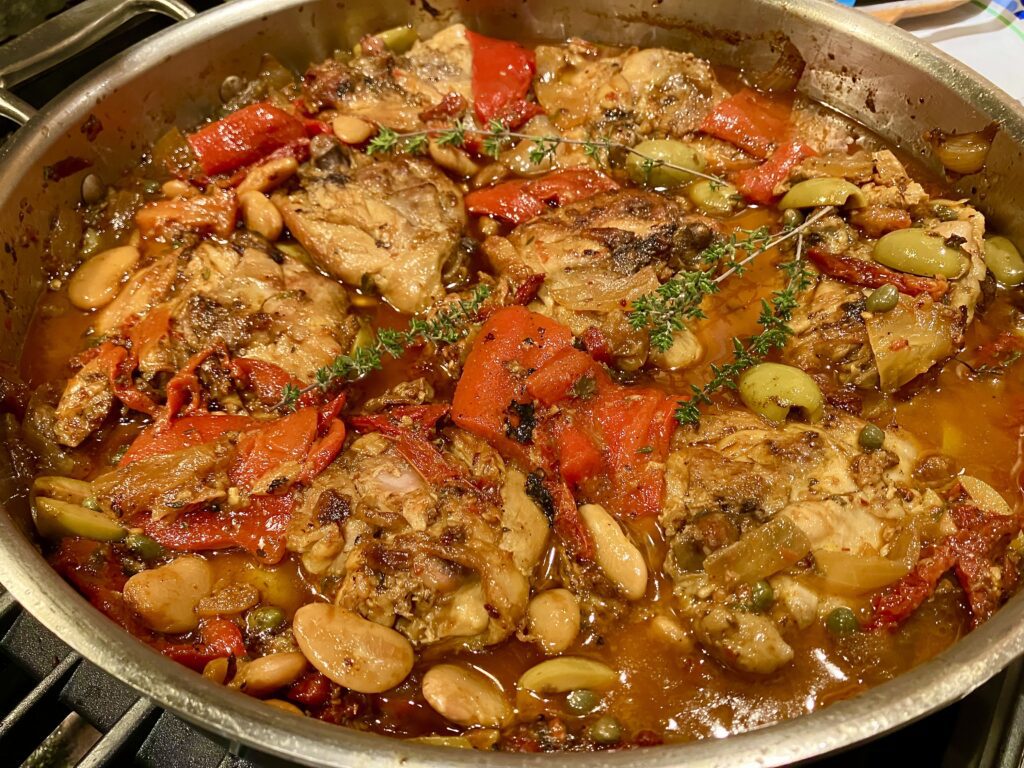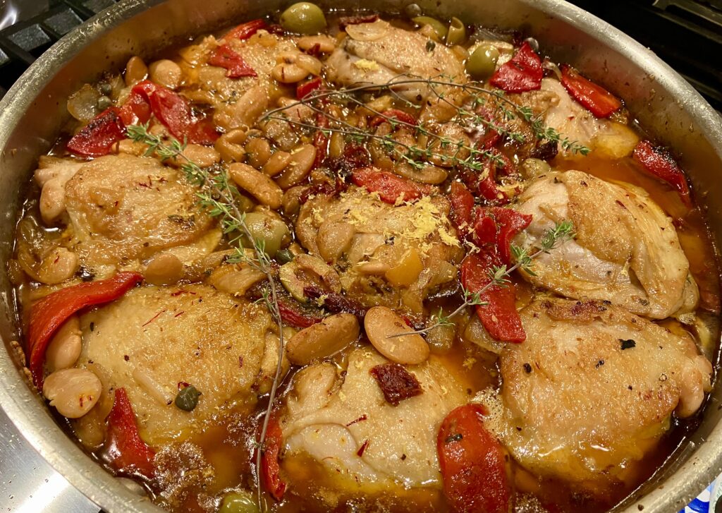 First we sear the chicken in virgin olive oil infused with garlic and then, when the chicken is removed to rest, the hot oils are joined by the onion, chicken bone broth, Sherry, roasted red peppers, olives, capers, sun dried tomatoes and herbs and spices… and the chicken is simmered until tender and luscious. This Spanish classic is an umami feast!