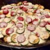 Blanch potatoes, peppers, onions, mushrooms and fennel in a large skillet in olive oil and butter. Transfer to double sheets of parchment paper on a cookie sheet and drizzle with Pastis. Add a couple of rosemary sprigs for the aroma of Provence.
