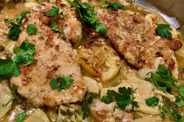 Piccata is an Italian style of cooking in which either veal or chicken is pounded flat into cutlets, dipped in egg whites, dredged in flour and Parmigiano cheese, and then pan fried. Like all Italian cooking, very fresh and high quality ingredients are the secret. We find that Parmigiano Reggiano that has been aged two to three years makes a big difference, as well as extra rich chicken bone broth, free range air chilled chicken thighs (much richer tasting than chicken breasts), and high quality virgin olive oil. The combination of creamy young artichoke hearts and a lemony butter sauce make this meal a crowd favorite. And if that crowd is your family and close friends, this meal will be the one they barge back into the kitchen for… to ask for seconds and thirds, and most of all, for more sauce.